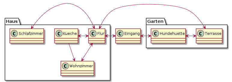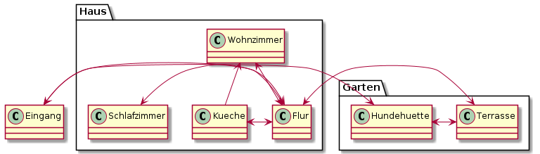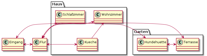 Nach einigem Schieben (vor allem zu beachten: die umgedrehte Assoziation zwischen Küche und Wohnzimmer) kommen wir zu folgendem Code und dem daraus resultierenden Diagramm, mit dem wir uns absolut zufrieden geben können:
